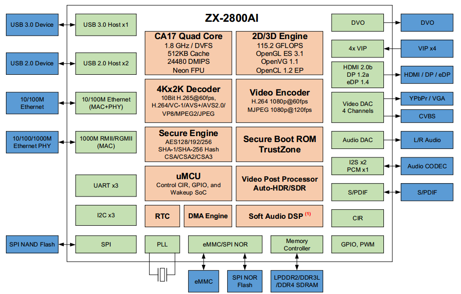 兆芯ZX-2800AI四核 ARM Cortex-A17 1.8G主频 512KB L2缓存 24480DMIPS计算能力 |