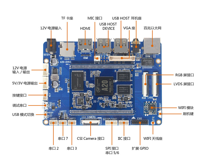 A20-Core模块集成1GB DDR3内存和4GB NAND存储器,集成PMU芯片,集成音频Codec功能,提供丰富的外设资源:USB、UART、SDIO、SPI、IIC、GPIO。支持驱动RGB/LVDS接口的显示屏,最大分辨率1280x800。