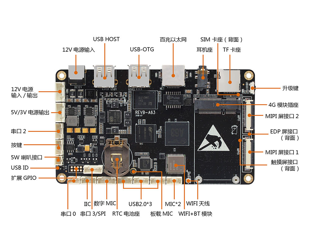 REVB-A63搭载了珠海全志的A63芯片,ARM Cortex-A53架构64位CPU,1.8GHz主频,集成Mali-T760 GPU,主频732M,适合运行图像识别算法。具有超强的视频解码能力,兼容所有主流的视频格式,能够支持H.265格式4K / 60帧10bit视频。
