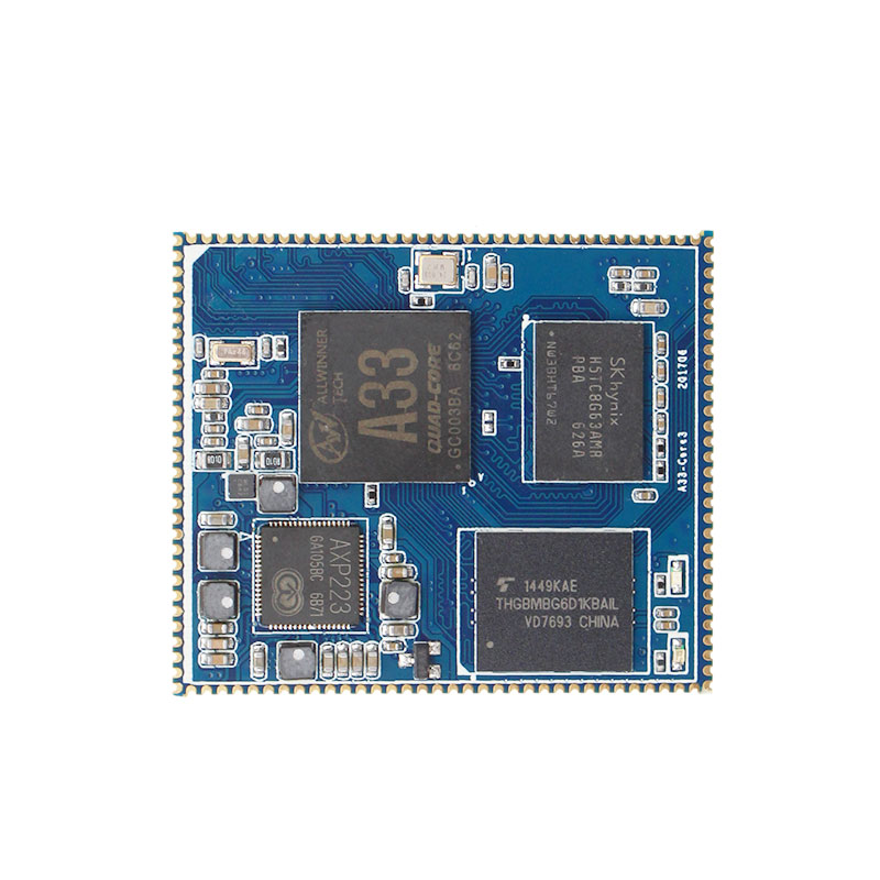 A33-Core3模块集成1GB DDR3内存和8GB EMMC存储器,集成PMU芯片,带电池充放电管理,集成音频Codec功能。GPU为Mali400 MP2 可满足一般的视频编解码需求(1080P@60fps),提供丰富的外设资源:USB、UART、SDIO、SPI、IIC、GPIO。支持驱动RGB/LVDS/MIPI接口的显示屏,最大分辨率1280x800。