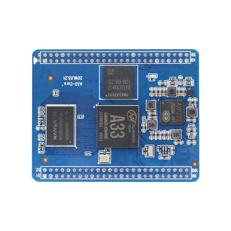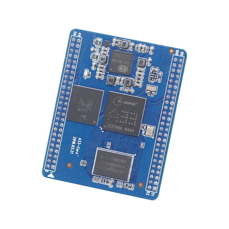 A33-Core模块集成512M DDR3内存和4GB EMMC存储器,集成PMU芯片,带电池充放电管理。集成音频Codec功能,GPU为Mali400 MP2 可满足一般的视频编解码需求(1080P@60fps),提供丰富的外设资源:USB、UART、SDIO、SPI、IIC、GPIO。支持驱动RGB/LVDS接口的显示屏,最大分辨率1280x800。