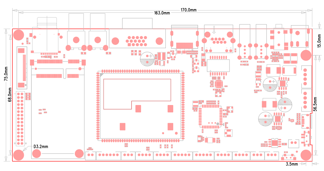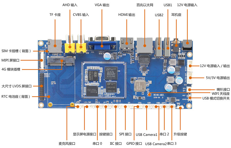 12V直流供电 DC5.5座+4P-2.54座 5V和3V电源输出 给外设供电 |