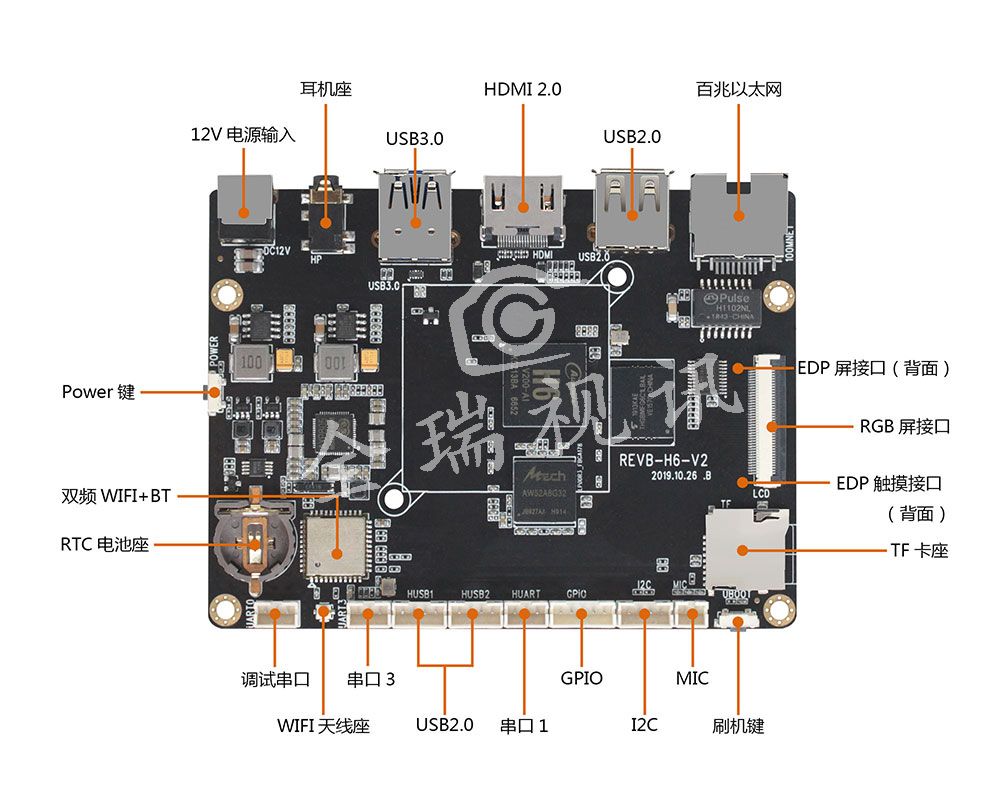 REVB-H6-V2搭载了珠海全志的H6芯片,ARM Cortex-A53架构64位CPU,1.8GHz主频,集成Mali-T720低功耗GPU,主频700M,适合运行图像识别算法。具有超强的视频解码能力,兼容所有主流的视频格式,能够支持H.265格式4K / 60帧10bit视频,支持4K/800万像素USB摄像头硬件MJPEG解码。